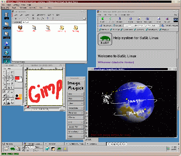 SuSE 6.3 is shown in this screen shot with its file manager, Netscape, The Gimp, and Image
